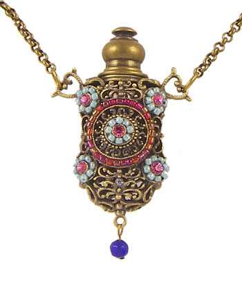 Our jeweled Ancient Secrets keepsake pendant necklace has a vintage, antique appeal accented with faux turquoise and fuchsia stones. Antique gold finish.