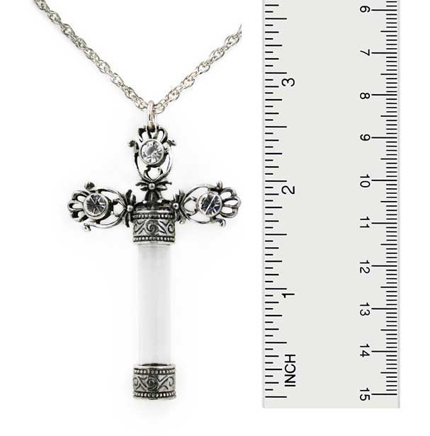 The pewter filigree cross perfume pendant has a non-removable glass vial and 30" inch chain. The pendant measures 2.75" Tall by 3/8" Wide. It will hold approximately 1 ML of anointing oil, or perfume. Packaged in a gift box. Includes a pipette to fill the vial.