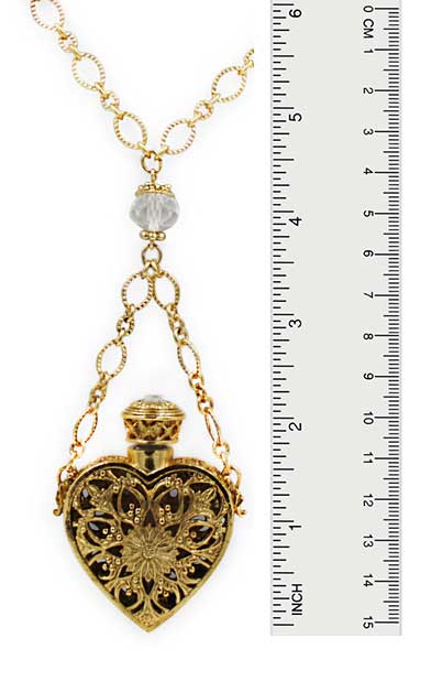 The perfume pendant has a non-removable glass vial inside and 32" inch chain. The heart measures 2.25" Tall by 1 1/2 " Wide. It will hold approximately 1 ML of perfume, anointing oil or essential oil. Packaged in a gift box. Includes a plastic pipette to fill the vial.